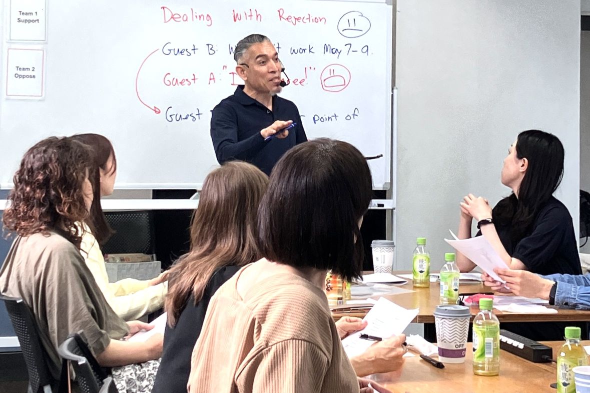 現実の場面設定、ロールプレイを多く用います。オンライン・対面あり